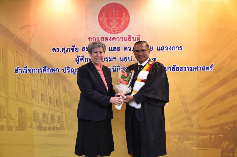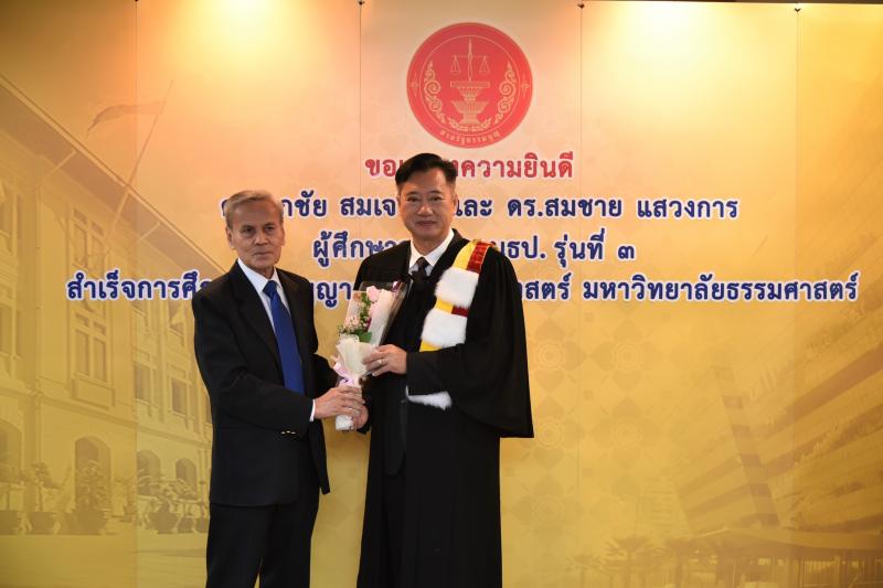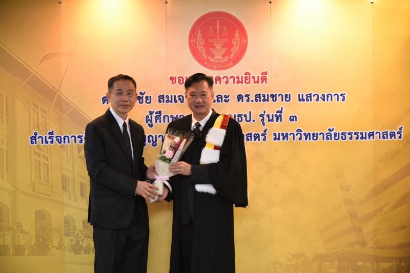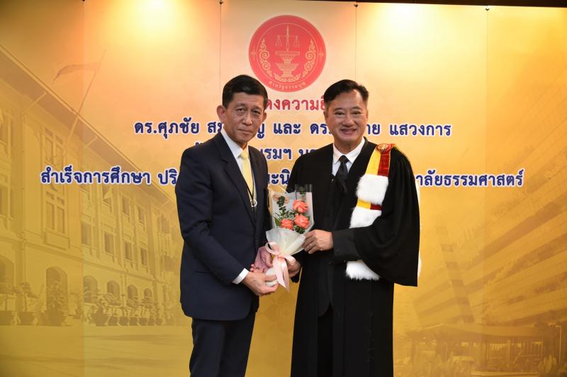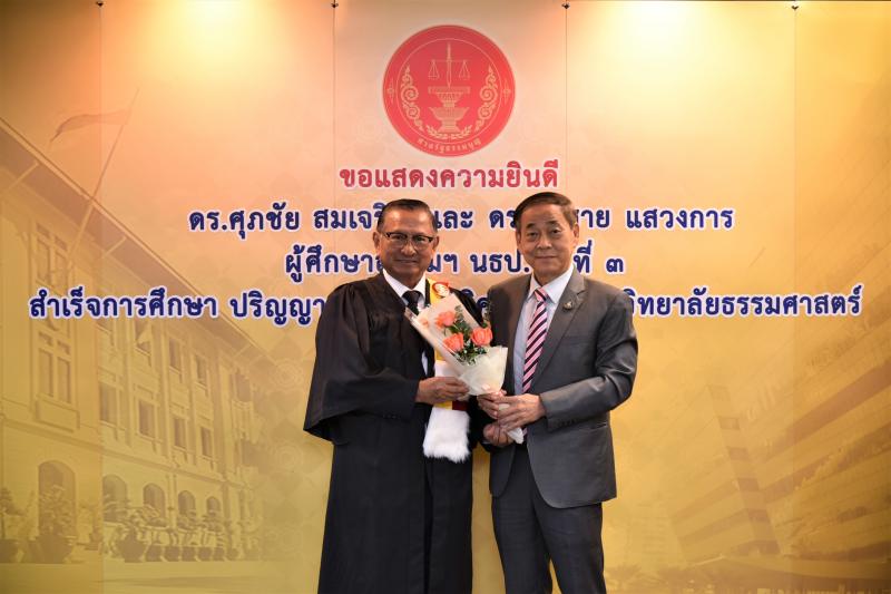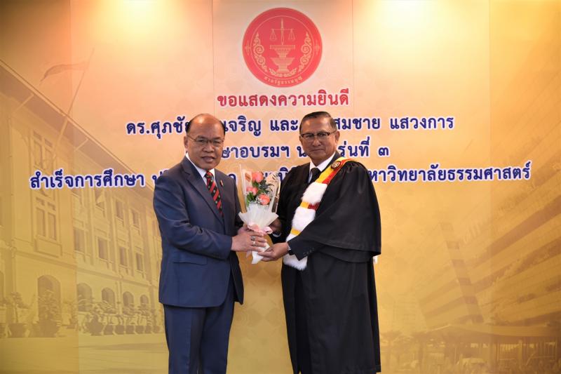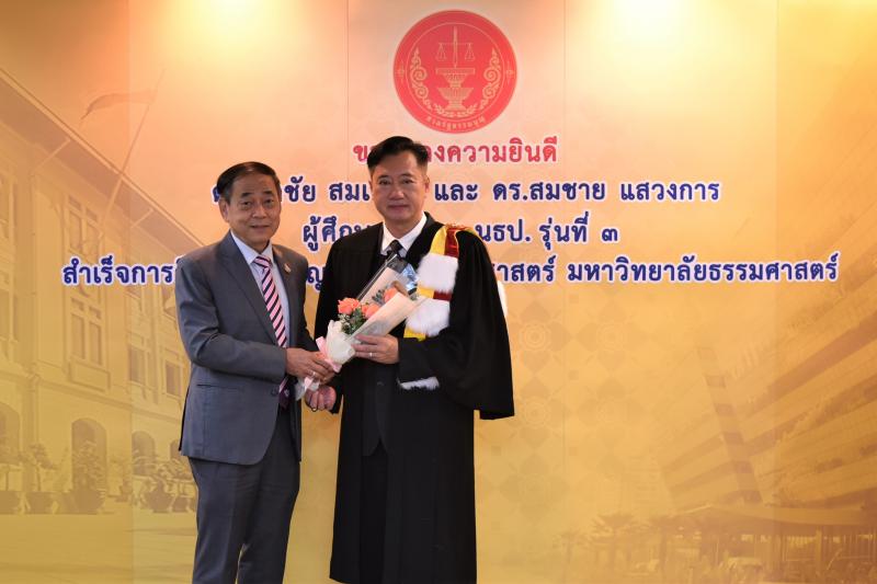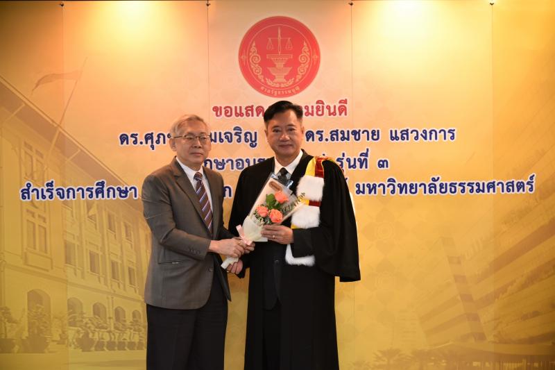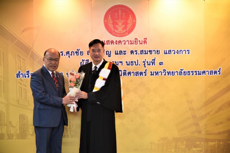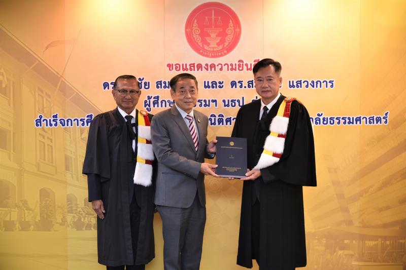 ทั้งนี้ ดร.ศุภชัยฯ และดร.สมชายฯ เป็นผู้สำเร็จการศึกษาอบรมหลักสูตร "หลักนิติธรรมเพื่อประชาธิปไตย” (นธป.) รุ่นที่ ๓ และในหลักสูตรการศึกษาอบรมดังกล่าวได้มีการบันทึกข้อตกลงความร่วมมือทางวิชาการระหว่างสำนักงานศาลรัฐธรรมนูญกับมหาวิทยาลัยธรรมศาสตร์ ซึ่งได้จัดทำขึ้นเพื่อให้เกิดความร่วมมืออย่างเป็นระบบระหว่างสองหน่วยงาน รวมทั้งพัฒนาองค์ความรู้ เทคโนโลยี บุคลากร ตลอดจนส่งเสริมและสนับสนุนการเผยแพร่ความรู้ที่เกี่ยวกับกระบวนการยุติธรรม การคุ้มครองสิทธิและเสรีภาพของประชาชนภายใต้รัฐธรรมนูญ และเสริมสร้างความเชื่อมั่นในกระบวนการยุติธรรมของประเทศ อันจะส่งผลต่อความมั่นคงต่อการปกครองในระบอบประชาธิปไตยอันมีพระมหากษัตริย์ทรงเป็นประมุข ต่อไป |
