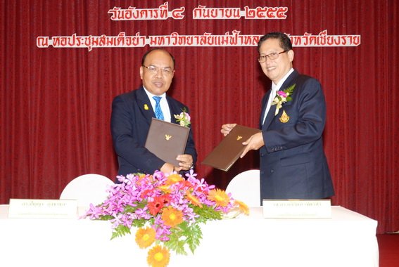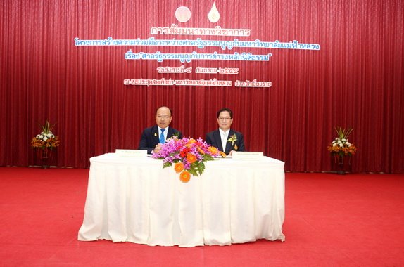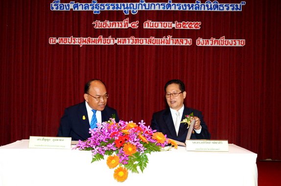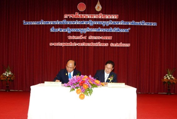 นายปัญญา อุดชาชน รองเลขาธิการสำนักงานศาลรัฐธรรมนูญ และรองศาสตราจารย์ ดร. อภิรัตน์ เพ็ชรศิริ คณบดีสำนักวิชานิติศาสตร์ มหาวิทยาลัยแม่ฟ้าหลวง ได้ร่วมลงนามในบันทึกข้อตกลงความร่วมมือทางวิชาการ (MOU) ระหว่างสำนักงานศาลรัฐธรรมนูญ และมหาวิทยาลัยแม่ฟ้าหลวง เพื่อเผยแพร่ความรู้ความเข้าใจเกี่ยวกับสิทธิและเสรีภาพของประชาชน เผยแพร่องค์ความรู้เกี่ยวกับคำวินิจฉัยศาลรัฐธรรมนูญกับการดำรงหลักนิติธรรม รวมทั้งกิจกรรมพัฒนาศักยภาพทางวิชาการ และส่งเสริมความสำนึกรับผิดชอบต่อสังคม เมื่อวันอังคารที่ 4 กันยายน 2555 ณ มหาวิทยาลัยแม่ฟ้าหลวง อำเภอเมือง จังหวัดเชียงราย |