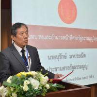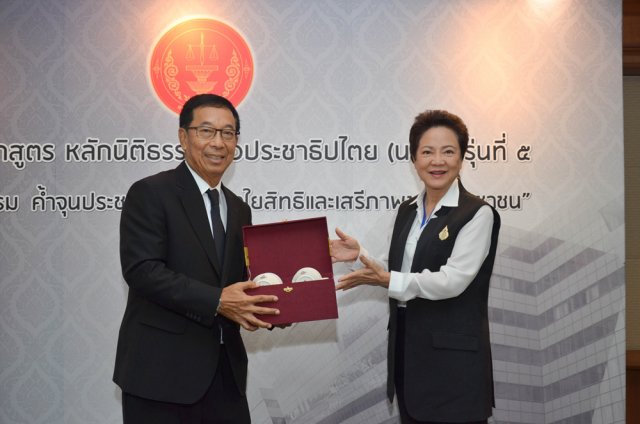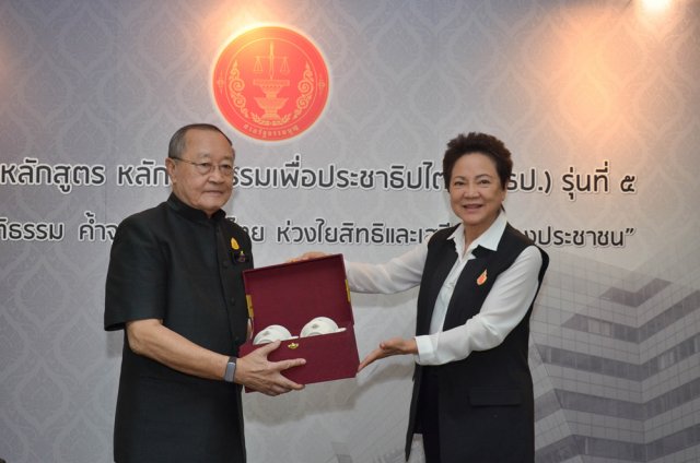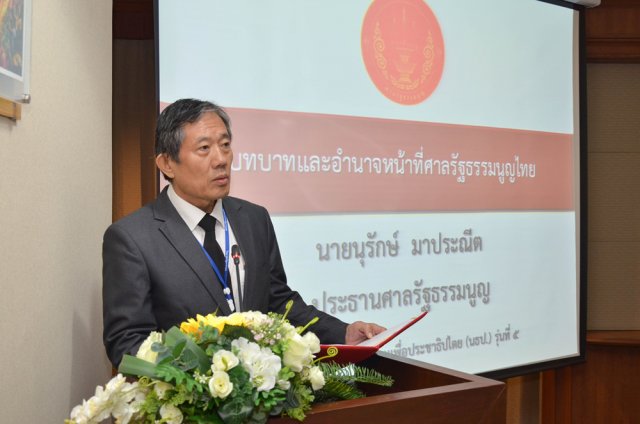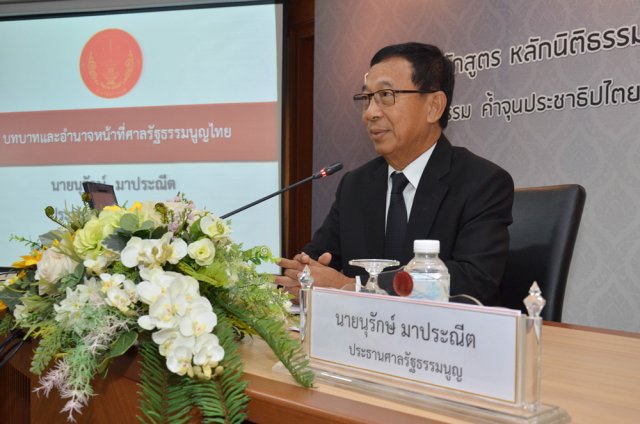 เมื่อวันที่ ๘ กุมภาพันธ์ ๒๕๖๐ นายนุรักษ์ มาประณีต ประธานศาลรัฐธรรมนูญ ให้เกียรติบรรยายพิเศษ หัวข้อ "บทบาทและอำนาจหน้าที่ศาลรัฐธรรมนูญไทย” และนำผู้เข้าอบรมหลักสูตร หลักนิติธรรมเพื่อประชาธิปไตย (นธป.) รุ่นที่ ๕ ชมสถานที่ภายในสำนักงานศาลรัฐธรรมนูญโดยมีนายปัญญา อุดชาชน ตุลาการศาลรัฐธรรมนูญ ร่วมบรรยายในการเยี่ยมชมสถานที่ดังกล่าว และในช่วงบ่ายได้รับเกียรติจากนายสุเมธ ตันติเวชกุล กรรมการและเลขาธิการมูลนิธิชัยพัฒนา บรรยายพิเศษ เรื่อง "การประยุกต์ใช้ปรัชญาเศรษฐกิจพอเพียงเพื่อพัฒนาคุณธรรม พื้นฐานในสังคม เศรษฐกิจ การเมืองไทย ณ ห้องประชุม ชั้น ๔ สำนักงานศาลรัฐธรรมนูญ อาคารราชบุรีดิเรกฤทธิ์ ศูนย์ราชการเฉลิมพระเกียรติ ๘๐ พรรษา ๕ ธันวาคม ๒๕๕๐ ถนนแจ้งวัฒนะ กรุงเทพ มหานคร |