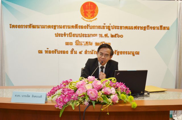 สำนักงานศาลรัฐธรรมนูญจัดอบรมทางวิชาการภายใต้ โครงการพัฒนามาตรฐานงานคดีรองรับการเข้าสู่ประชาคมเศรษฐกิจอาเซียน ซึ่งได้จัดให้มีการบรรยายในหัวข้อ "กระบวนการยื่นคำร้องของประชาชนโดยตรงต่อศาลรัฐธรรมนูญ ตามรัฐธรรมนูญฉบับใหม่ มาตรา ๒๑๓” โดยศาสตราจารย์ ดร.บรรเจิด สิงคะเนติ ผู้อำนวยการ หลักสูตรนิติศาสตรดุษฎีบัณฑิต สถาบันบัณฑิตพัฒนบริหารศาสตร์ ให้เกียรติมาเป็นวิทยากรบรรยาย โอกาสนี้นายวรวิทย์ กังศศิเทียม ตุลาการศาลรัฐธรรมนูญ นายปัญญา อุดชาชน ตุลาการศาลรัฐธรรมนูญ และนายพิมล ธรรมพิทักษ์พงษ์ เลขาธิการสำนักงานศาลรัฐธรรมนูญ ให้เกียรติเข้าร่วมรับฟังการบรรยายดังกล่าวพร้อมทั้งสอบถามประเด็นปัญหาต่างๆ ด้วย เมื่อวันที่ ๓๐ มีนาคม ๒๕๖๐ ณ ห้องรับรองชั้น ๙ สำนักงานศาลรัฐธรรมนูญ ศูนย์ราชการเฉลิมพระเกียรติ ๘๐ พรรษา ๕ ธันวาคม ๒๕๕๐ อาคารราชบุรีดิเรกฤทธิ์ ถนนแจ้งวัฒนะ กรุงเทพ มหานคร |