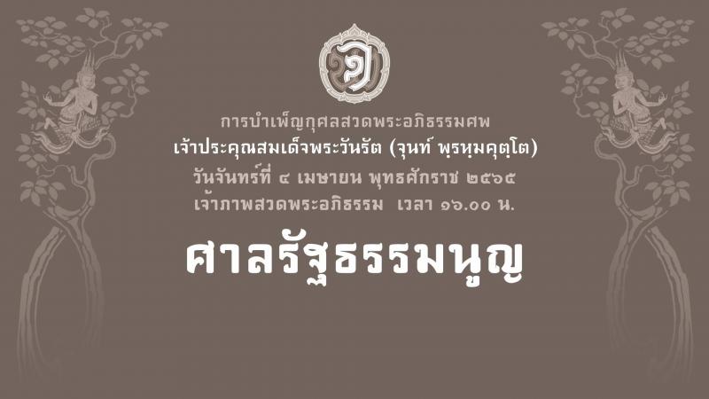 เมื่อวันที่ 4 เมษายน 2565 เวลา 16.00 น. ศาลรัฐธรรมนูญ ร่วมกับผู้ศึกษาอบรมหลักสูตร "หลักนิติธรรมเพื่อประชาธิปไตย" (นธป.) รุ่นที่ 10 บำเพ็ญกุศลสวด
